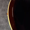 Cosmetic condition notes: minor finish wear. The headstock has some dimples on the end and bottom edge. The neck is clean and smooth in the hands, minor rub wear on the back only. The back has a dent on the top horn, dimples in the middle of the body, elbow area, back edge and near the cavity and some scuffs near the neck join. The sides have dimples and scuffs in the elbow area, near the jack and bottom horn. The front has light scuffs along the back edge, surface cracks in the topcoat only around the jack, dimples around the top F-hole and some play wear on the horns. Overall: very good condition (7.5/10)