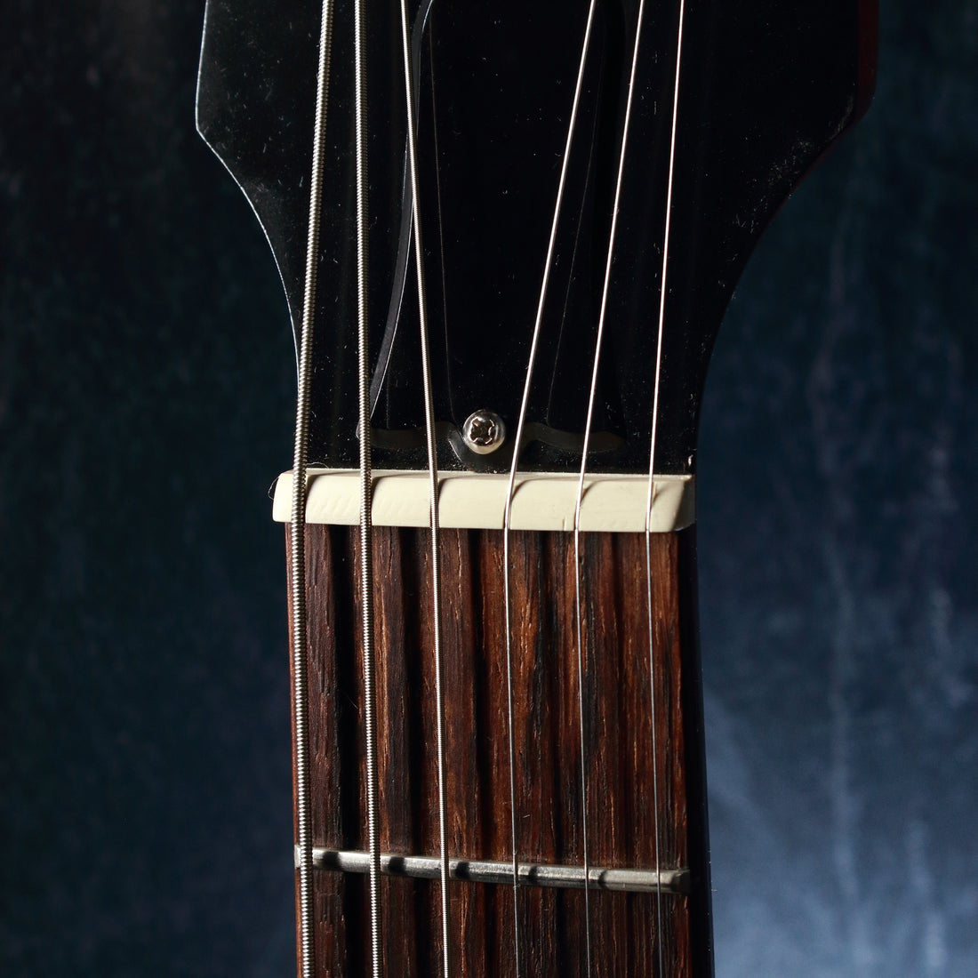 Playing condition notes: Action is low, neck is straight, intonation is good, truss rod works. The frets have minor wear only, 8/10 for fret life left. No headstock breaks! Setup with fresh 10/52 Moonshiners strings.