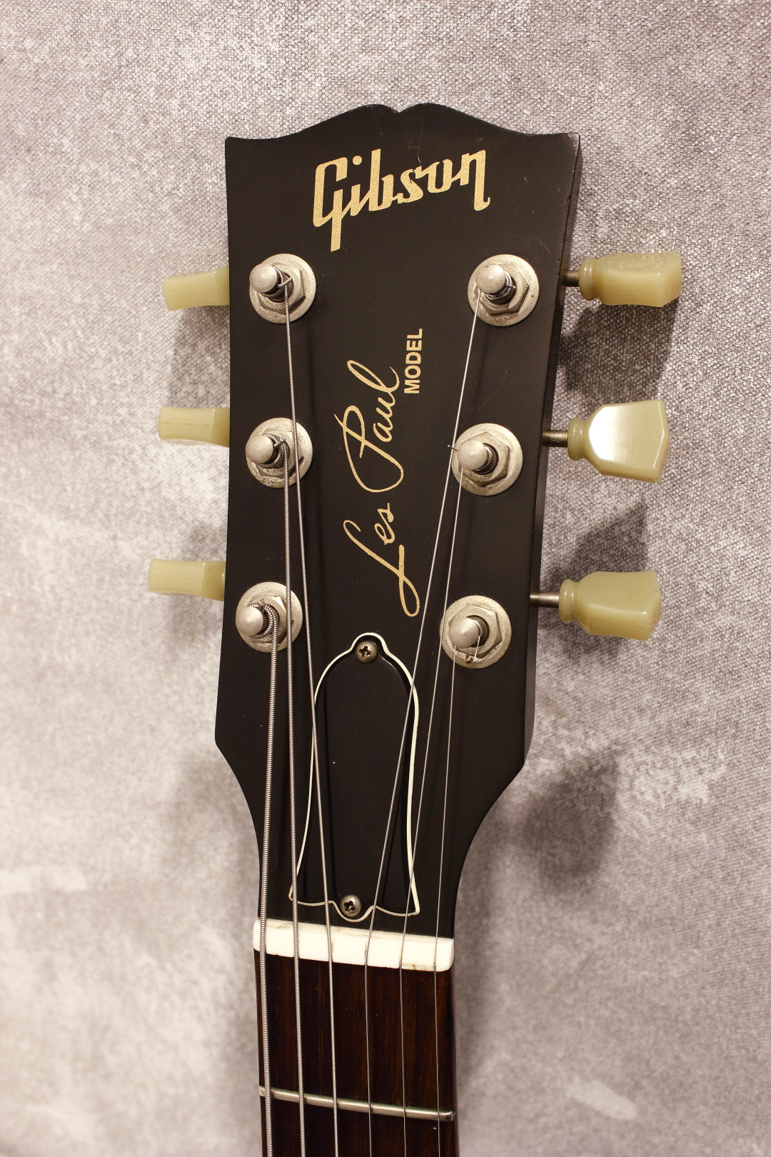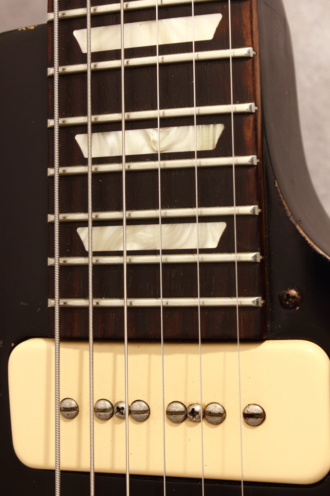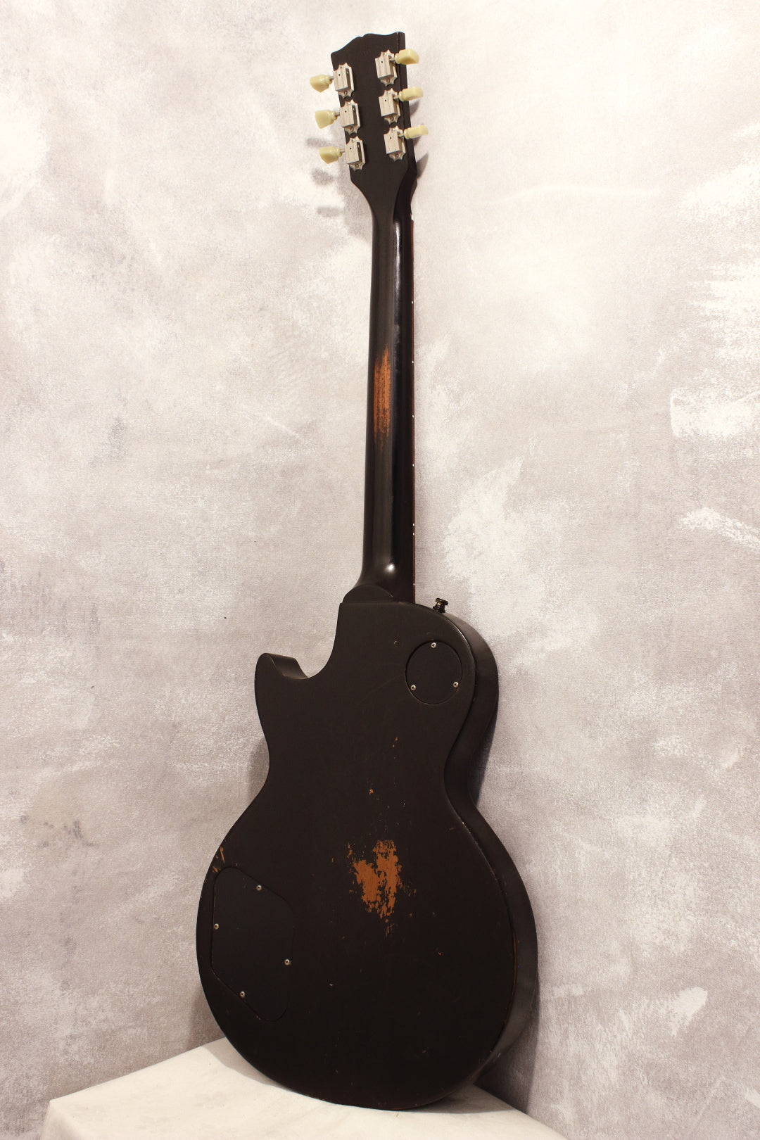 Gibson LP Studio with P90s, matte black, made in USA 2010. This is cool, right? First up, it looks great. The matte black finish is super thin, so it's worn through in a bunch of places and glossed up in others; it's got a real played in kinda look to it. Paired with the cream pickups and guard, it has a certain no-nonsense attitude that's half ritz, half scunge. Les Pauls always sound great with P90s, and this is no exception. There's a lovely slicing, crystal clear treble and a breathing, lively midrange you don't really get from a humbucker. Plus the natural dynamics come through more too, so there's a heap of punch and attack on deck. Into a dirty amp, playing big rhythm parts is an instant party; it's so fun. The neck is a comfy slim 60s shape and the body is nice and light, so it's never a wrestle to play. All in all: it just radiates swagger, it's got the Jack Sparrow thing going on.