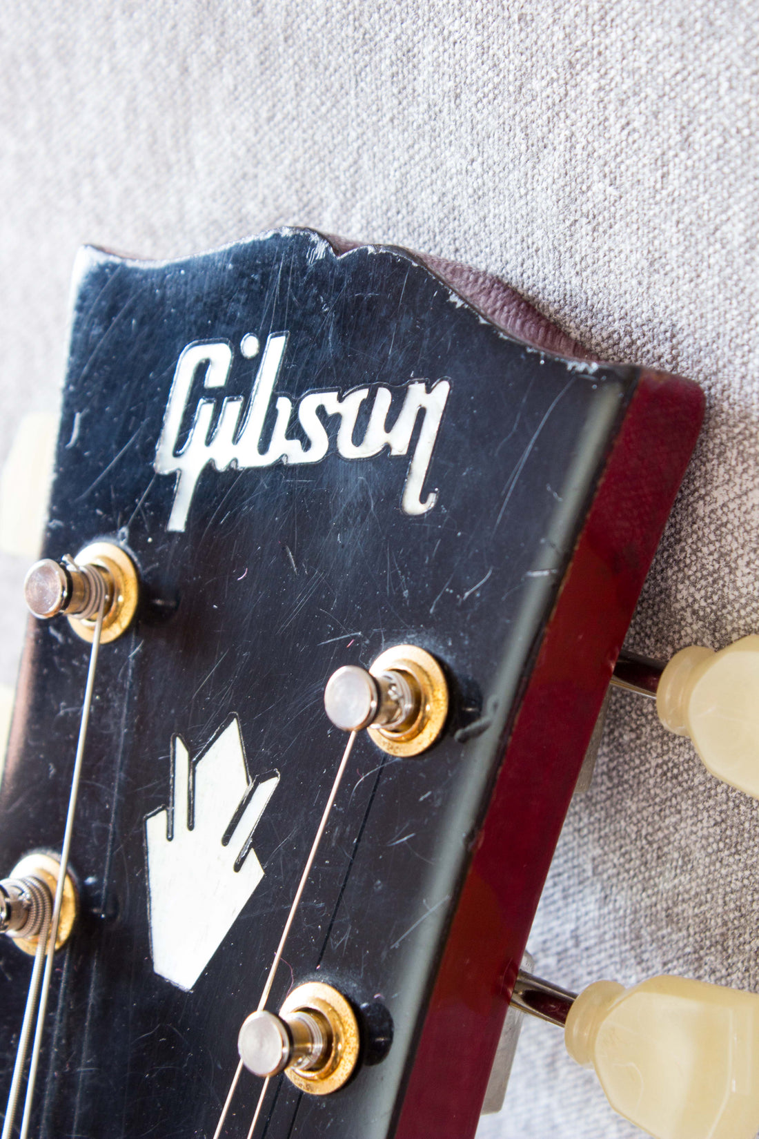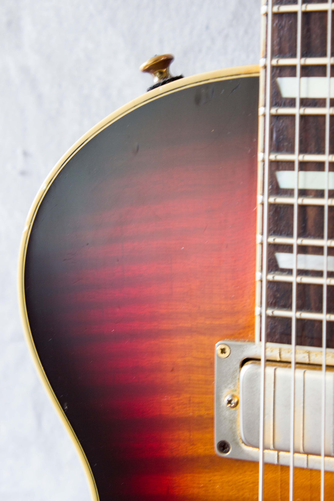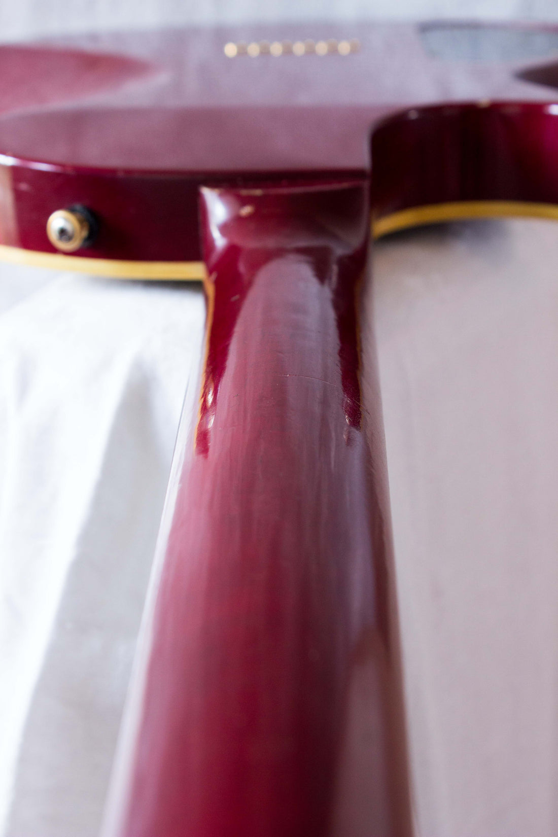 Cosmetic condition notes: minor finish wear. Headstock has some minor dimples and scuffs on front and back and end, no major marks though. The neck is smooth in the hands, minor dimples on the back only. The back has widespread light scuffs and dimples but no major marks. The sides have light scuffs around the whole body and some rub wear along the edge of the belly carve, but no major marks. The front is pretty clean, just a chip next to the binding near the knobs, a few dimples around the body and some rub wear from play. Overall: good condition (7/10).